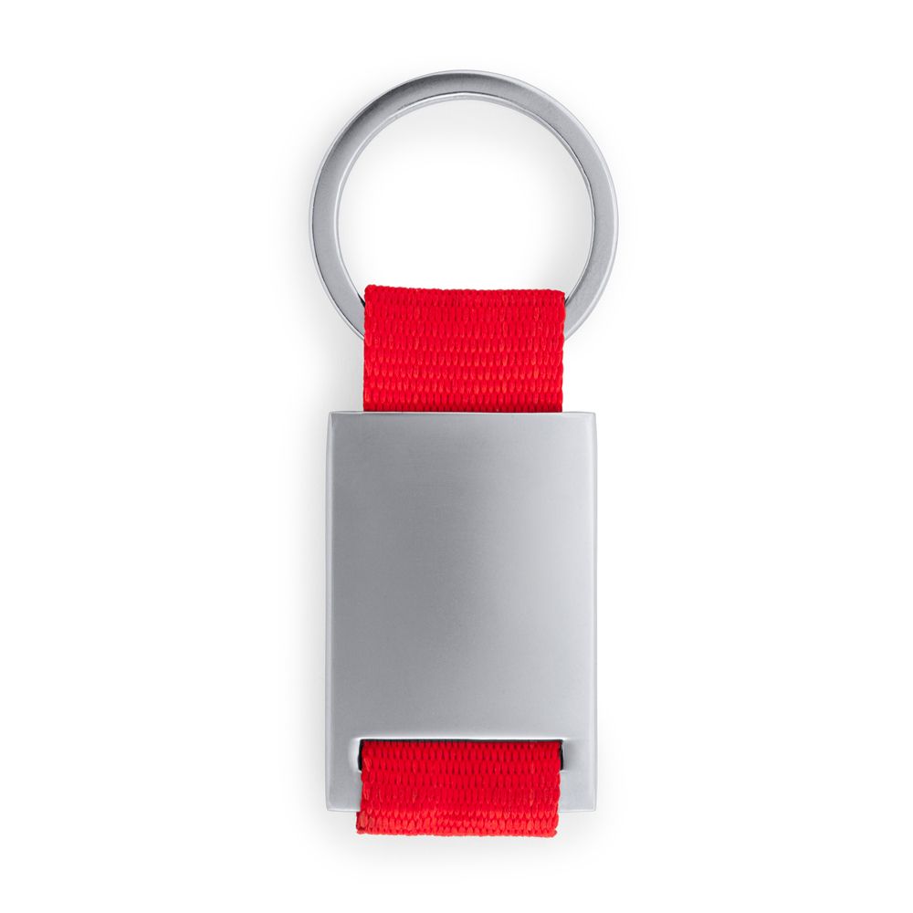 Metal keyring with coloured polyester strap.