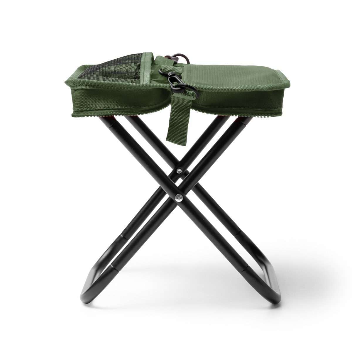 Its structure features a simple folding mechanism that allows it to be compacted into a practical zip-closure pouch for easy storage.